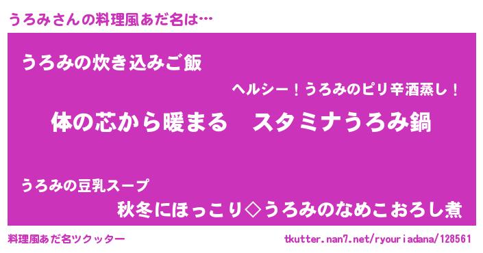 | 女子向けラノベタイトル風あだ名 | 『うろみの雑貨屋さん』『闇のうろみ』 |