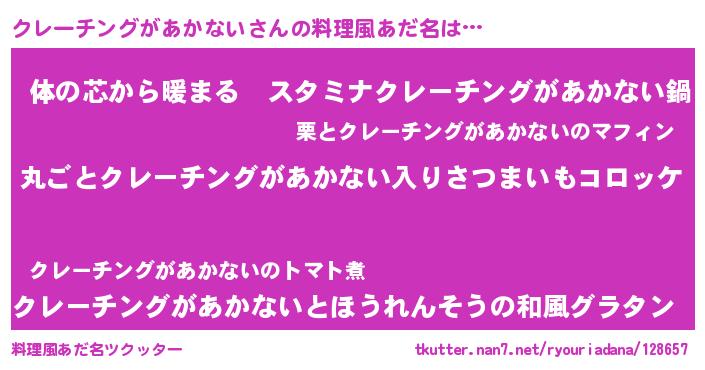 | 男性向けラノベタイトル風あだ名 | 『この素晴らしい世界にクレーチングがあかないを!』 |