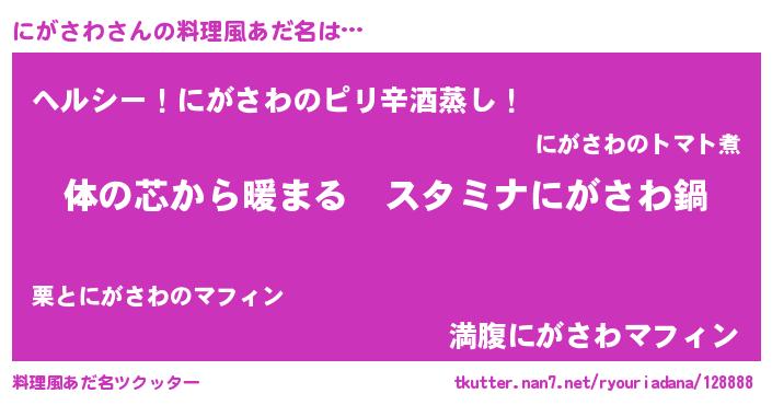 | 女子向けラノベタイトル風あだ名 | 『にがさわの雑貨屋さん』『闇のにがさわ』 |