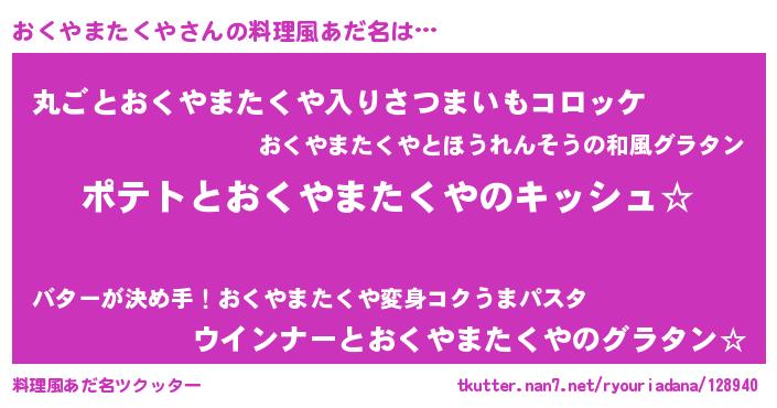 | 女子向けラノベタイトル風あだ名 | 『おくやまたくやの卵を拾いまして』 |
