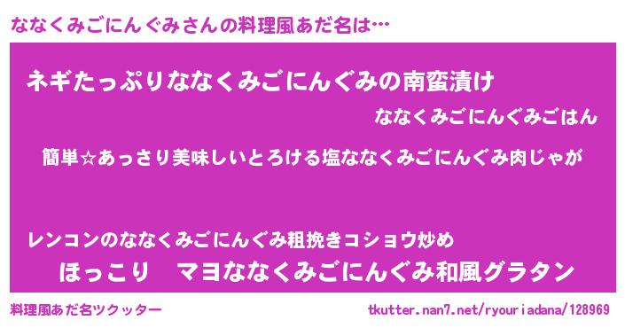 | 女子向けラノベタイトル風あだ名 | 『異世界でカフェななくみごにんぐみを開店しました。』 |