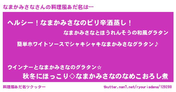 | 男性向けラノベタイトル風あだ名 | 『なまかみさなの嫁は女の子じゃないと思った?』 |