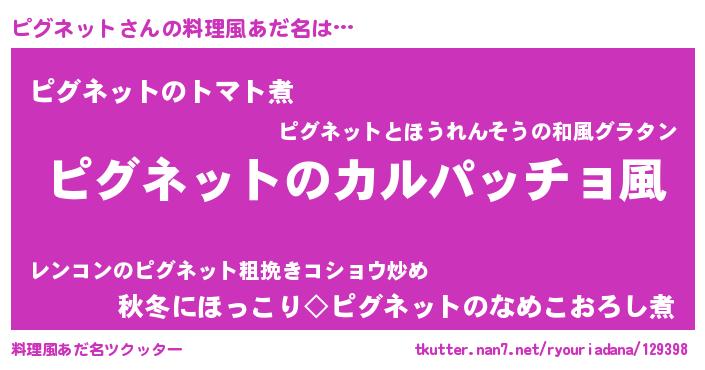 | 女子向けラノベタイトル風あだ名 | 『ピグネットが死なない童話 林檎のピグネットの診療簿』 |