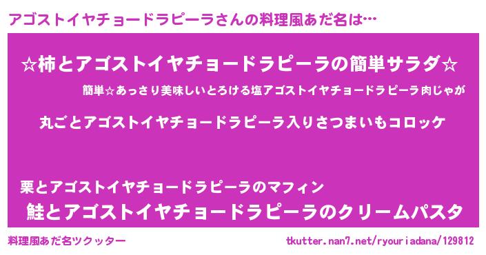 | 女子向けラノベタイトル風あだ名 | 『乙女ゲームの破滅フラグしかない悪役アゴストイヤチョードラピーラに転生してしまった…』 |