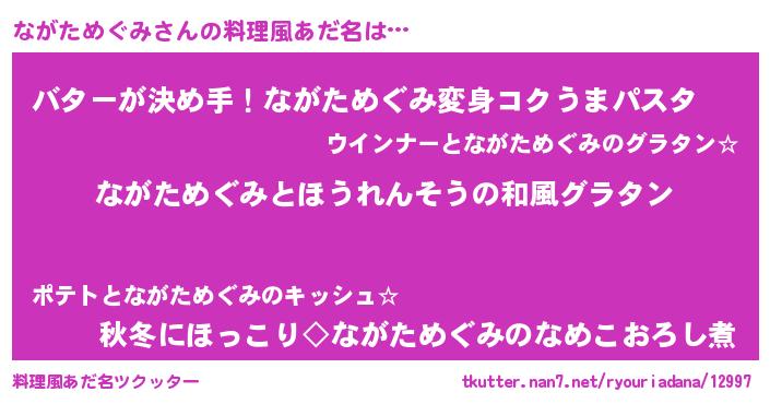 | 男性向けラノベタイトル風あだ名 | 『ながためぐみ~年齢イコール彼女いない歴の魔法使い~』 |