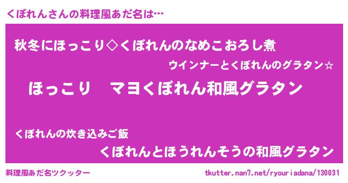 | ヒーロー風カッコイイあだ名 | 『仮面クボダー』『ウルトラくぼれんマン』 |