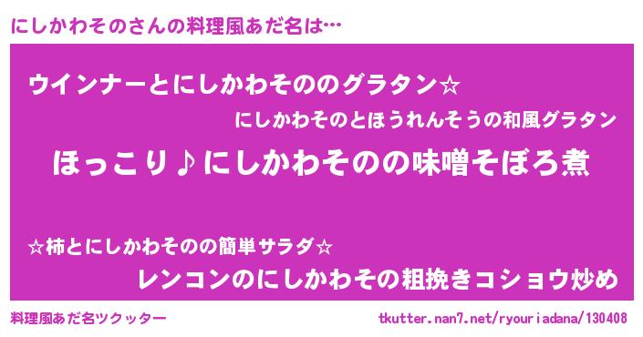 | 胡散臭い通販商品みたいなあだ名 | 『必ず成功する霊験あらたかなお札…その名も「にしかわその」』 |