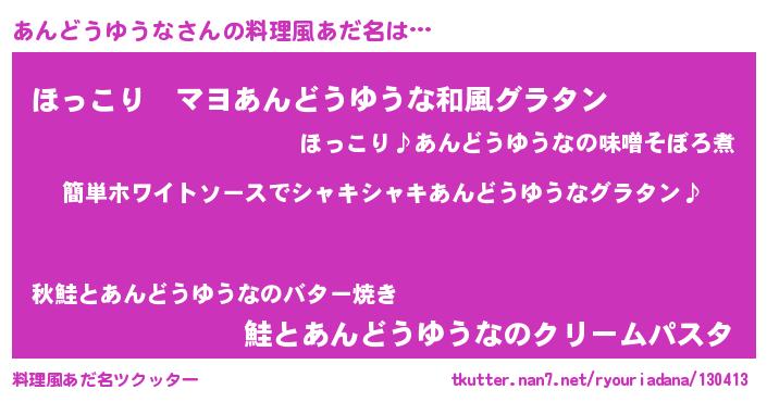 | 男性向けラノベタイトル風あだ名 | 『あんどうゆうなの嫁は女の子じゃないと思った?』 |