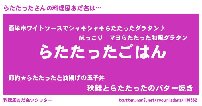 | 男性向けラノベタイトル風あだ名 | 『ラタタッタスレイヤー』 |