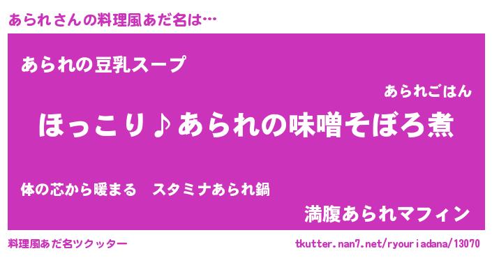 | 意味不明あだ名 | 『ペロリンあられ』『永久保存あられ』 |