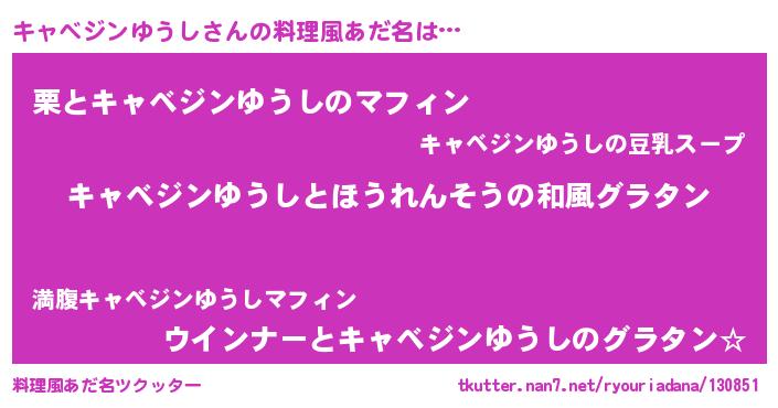 | 女子向けラノベタイトル風あだ名 | 『キャベジンゆうしの玉の輿計画!』 |