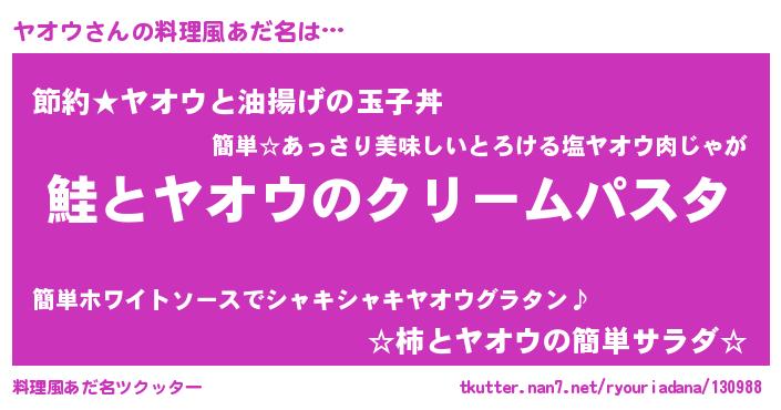 | 女子向けラノベタイトル風あだ名 | 『死神ヤオウの再婚』『ヤオウ様がみてる』 |