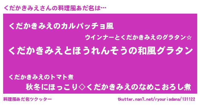 | 男性向けラノベタイトル風あだ名 | 『くだかきみえ~年齢イコール彼女いない歴の魔法使い~』 |