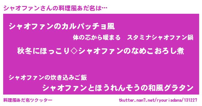 | ヘコむあだ名 | 『なまこ酢』『シャお』『シャにー』 |