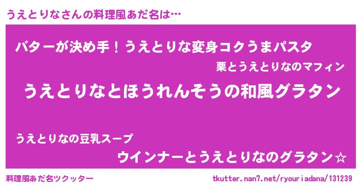 | 男性向けラノベタイトル風あだ名 | 『うえとりな~年齢イコール彼女いない歴の魔法使い~』 |