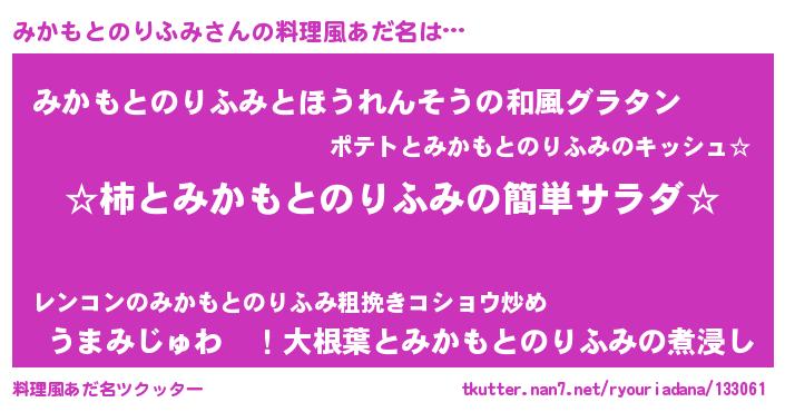 | 女子向けラノベタイトル風あだ名 | 『シンデレラみかもとのりふみ家の靴箱館』 |