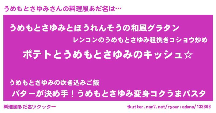 | 男性向けラノベタイトル風あだ名 | 『うめもとさゆみの嫁は女の子じゃないと思った?』 |