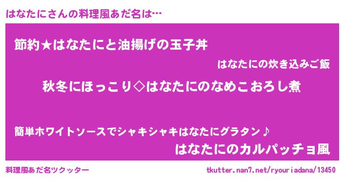 | 男性向けラノベタイトル風あだ名 | 『はなたにに滅ぼされるだけの簡単なお仕事です』 |