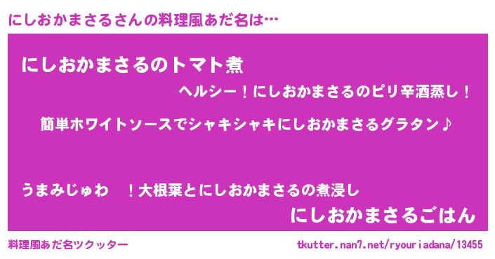 | 男性向けラノベタイトル風あだ名 | 『にしおかまさるの嫁は女の子じゃないと思った?』 |