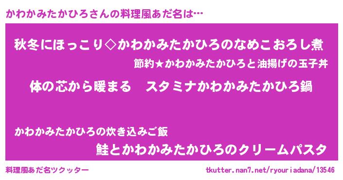 | 男性向けラノベタイトル風あだ名 | 『やはりかわかみたかひろの青春ラブコメはまちがっている 』 |
