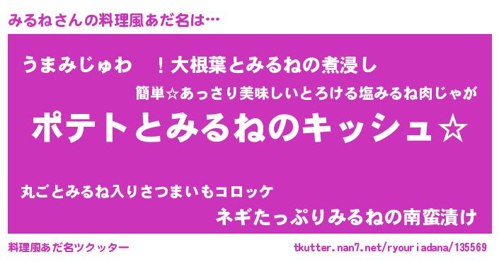 | 男性向けラノベタイトル風あだ名 | 『みるねの嫁は女の子じゃないと思った?』 |
