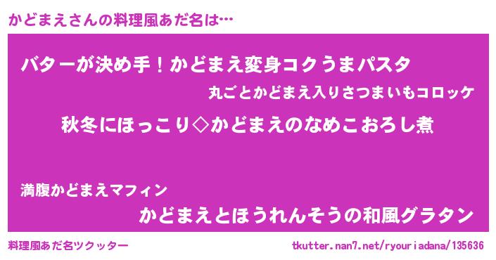 | ヘコむあだ名 | 『かどまえ(笑)』『かどぷりん』 |