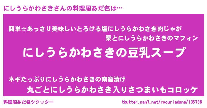 | ポケモン風あだ名 | 『ヒニシウラカワサキ』『ゼニニシ』 |