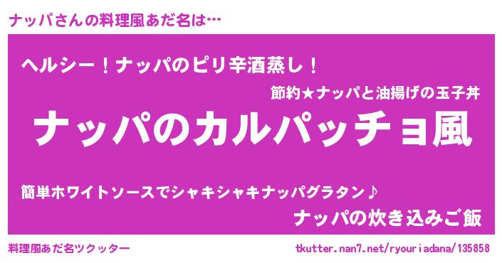 | 男性向けラノベタイトル風あだ名 | 『魔弾の王とナッパ』『ナッパの憂鬱』 |