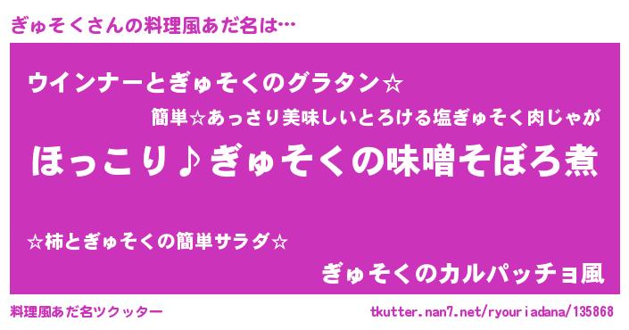 | 男性向けラノベタイトル風あだ名 | 『ぎゅそくの憂鬱』『魔弾の王とぎゅそく』 |