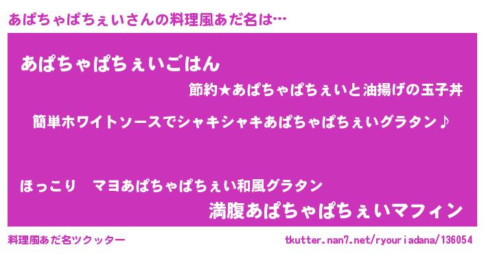 | 男性向けラノベタイトル風あだ名 | 『あぱちゃぱちぇいの嫁は女の子じゃないと思った?』 |