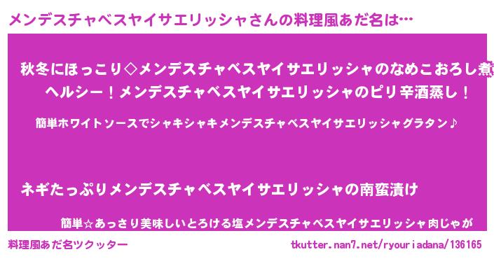 | 男性向けラノベタイトル風あだ名 | 『メンデスチャベスヤイサエリッシャの嫁は女の子じゃないと思った?』 |