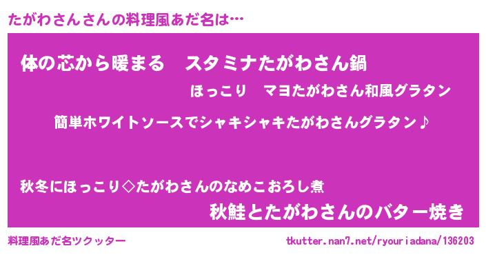 | ピコ太郎風あだ名 | 『タガ次郎』『ピタ太郎』『ピコタ郎』 |