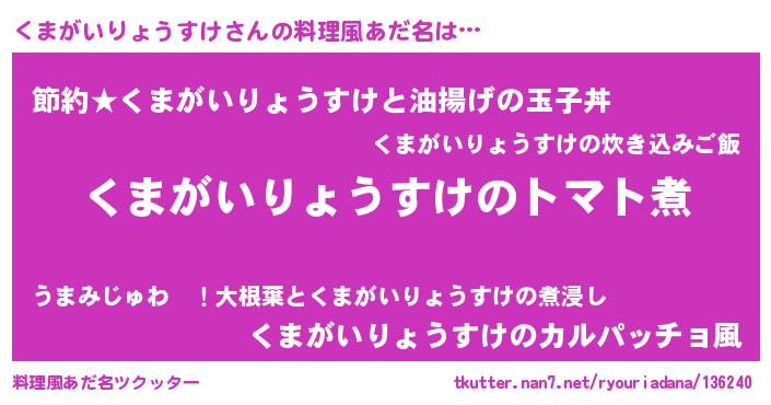 | 男性向けラノベタイトル風あだ名 | 『おまえをオタクにしてやるから、俺をくまがいりょうすけにしてくれ! 』 |