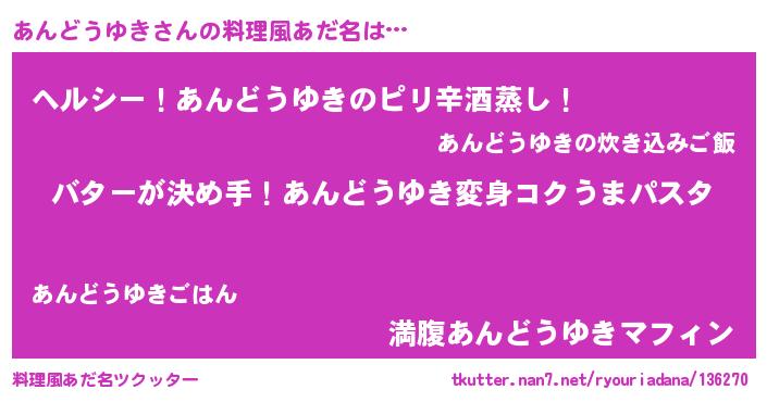 | ヘコむあだ名 | 『あんどうゆき(笑)』『あんふぇ~』 |