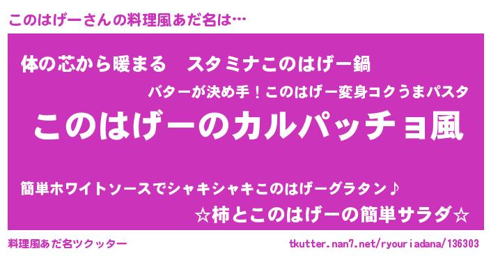 | 意味不明あだ名 | 『住所不定無職このはげー(43歳)』 |
