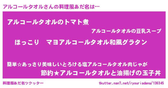 | 女子向けラノベタイトル風あだ名 | 『悪役アルコールタオルに転生したようですが、知った事ではありません』 |