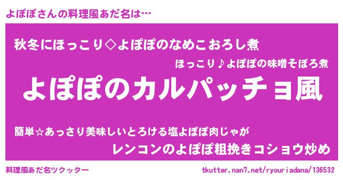 | 意味不明あだ名 | 『住所不定無職よぽぽ(2歳)』『自称よぽぽ』 |