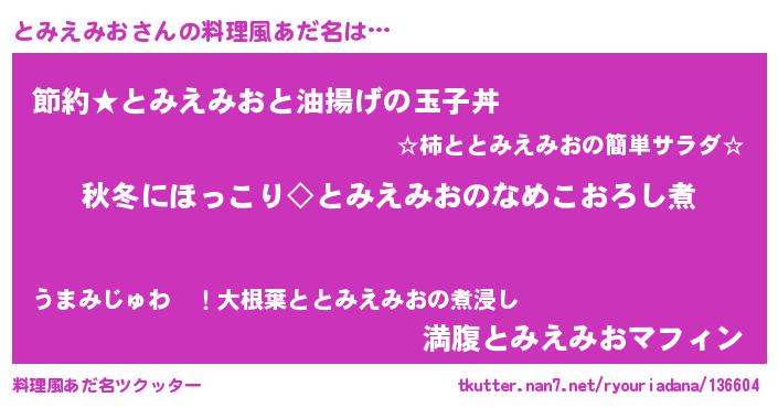 | 男性向けラノベタイトル風あだ名 | 『とみえみおに滅ぼされるだけの簡単なお仕事です』 |