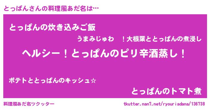 | 男性向けラノベタイトル風あだ名 | 『Re:とっぱんから始める異世界生活』 |