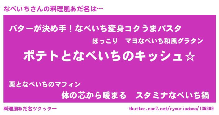 | 女子向けラノベタイトル風あだ名 | 『なべいちの卵を拾いまして』 |