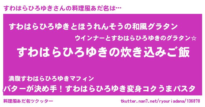 | 男性向けラノベタイトル風あだ名 | 『うちのすわはらひろゆきが世界を掌握している!』 |