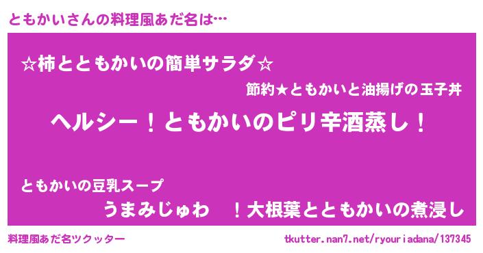 | 男性向けラノベタイトル風あだ名 | 『Re:ともかいから始める異世界生活』 |