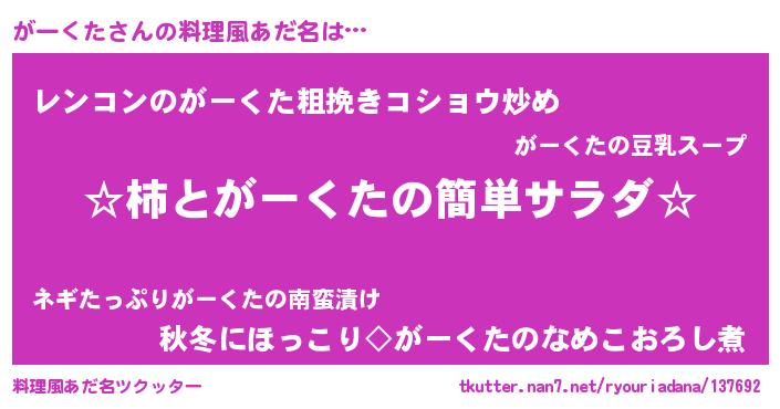 | 意味不明あだ名 | 『自称がーくた』『ペロリンがーくた』 |