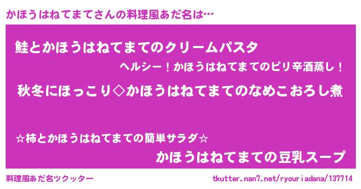 | 男性向けラノベタイトル風あだ名 | 『かほうはねてまてに滅ぼされるだけの簡単なお仕事です』 |