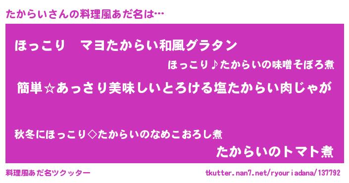 | 意味不明あだ名 | 『永久保存たからい』『ペロリンたからい』 |
