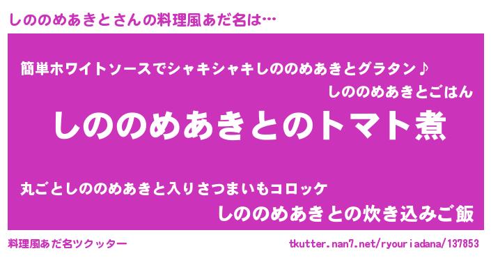 | 女子向けラノベタイトル風あだ名 | 『しののめあきと夫妻のなれそめ』 |