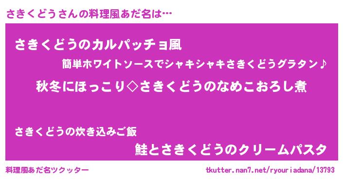 | 男性向けラノベタイトル風あだ名 | 『さきくどうに滅ぼされるだけの簡単なお仕事です』 |
