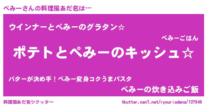 | 男性向けラノベタイトル風あだ名 | 『ぺみーの嫁は女の子じゃないと思った?』 |