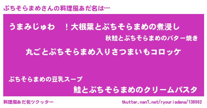 | 女子向けラノベタイトル風あだ名 | 『乙女ゲームの破滅フラグしかない悪役ぷちそらまめに転生してしまった…』 |