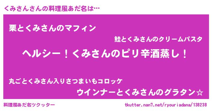 | 男性向けラノベタイトル風あだ名 | 『Re:くみさんから始める異世界生活』 |